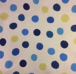 Tygmetervara med prickar i lime, blå och ljus turkos. 100% Bomull. Tygets bredd 140cm. Mönsterpass 0,63m (inte nödvändigt eftersom prickarna finns överallt). Avklippt tyg bytes ej. Priset anger meterpriset.