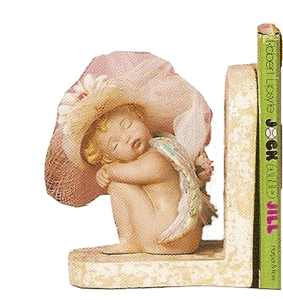 Ängel sittande, blundar, ihopkrupen, huvud till höger. Kan sitta ensam, men man kan även ha den som ljusstake med ljusfäste S-2752, (som då sätts på ryggen), men också på ett bokstöd nr: S-1014. Priset anger vit omålad keramik.