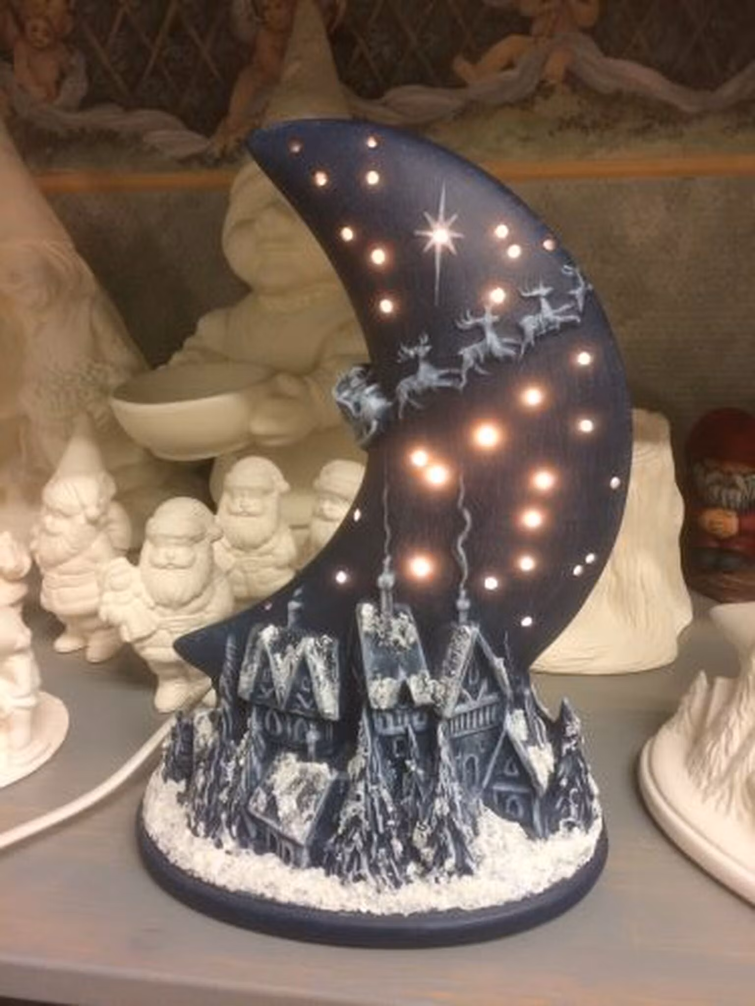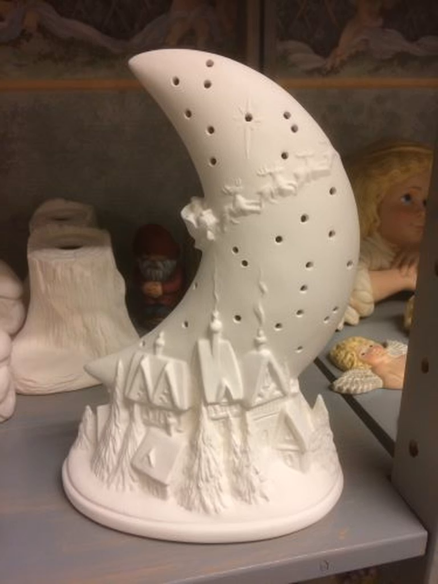 Månlampa, stad i vinterskrud med tomteekipage på himlen, G-2374. Går att ha belysning i. Gjuts i form från Gare. Priset anger vit omålad keramik.